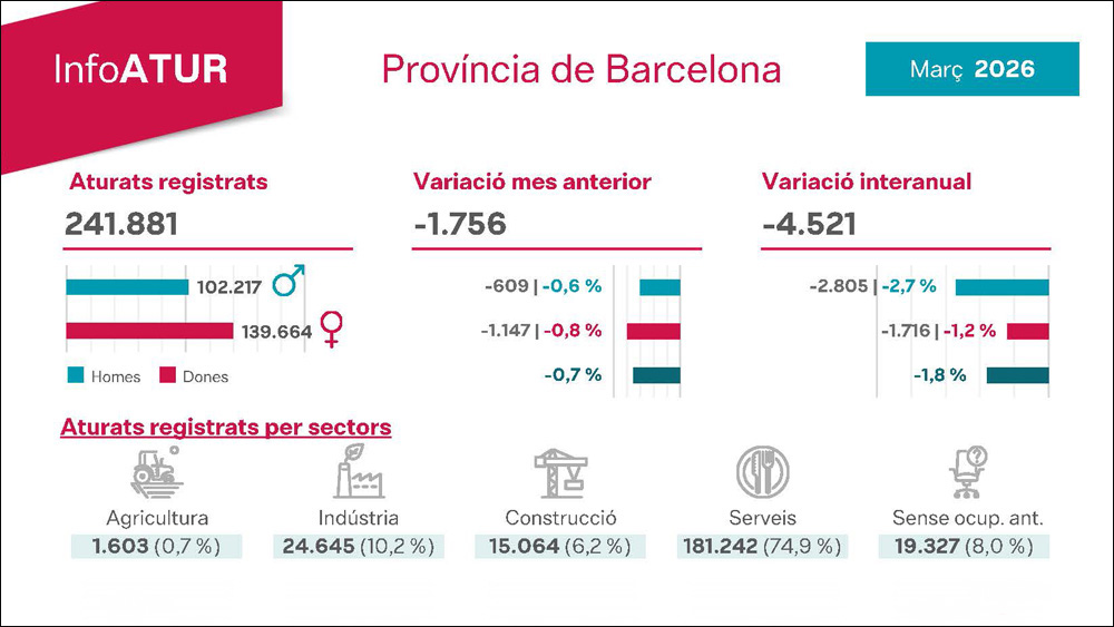 El més recent informe sobre l’atur a la província de Barcelona revela una caiguda del 0,7% en el nombre de persones inscrites com a demandants d’occupació durant el mes de març. Després de tres mesos d’augment, aquesta dada és considerat una bona notícia, ja que la xifra final es fixa en 241.881 persones aturades, la més baixa en un mes de març des de 2008.