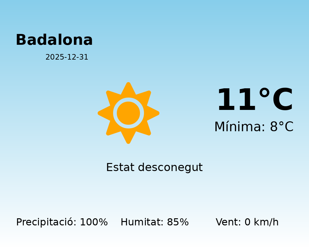 En la jornada d’avui, 31 de desembre de 2025, es preveu un dia especialment humit a Badalona. La temperatura es mantindrà en un rang restringit, amb una màxima de 11°C i una mínima de 8°C.