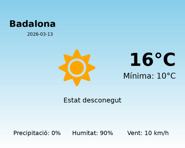 Avui a Badalona, el dia es presenta amb temperatures moderades i un ambient humit. La temperatura màxima prevista és de 16°C, mentre que la mínima se situarà al voltant dels 10°C. Aquestes condicions ofereixen un clima agradable per a aquells que vulguin gaudir d’activitats a l’aire lliure, tot i que caldrà anar preparat per a la humitat elevada.
