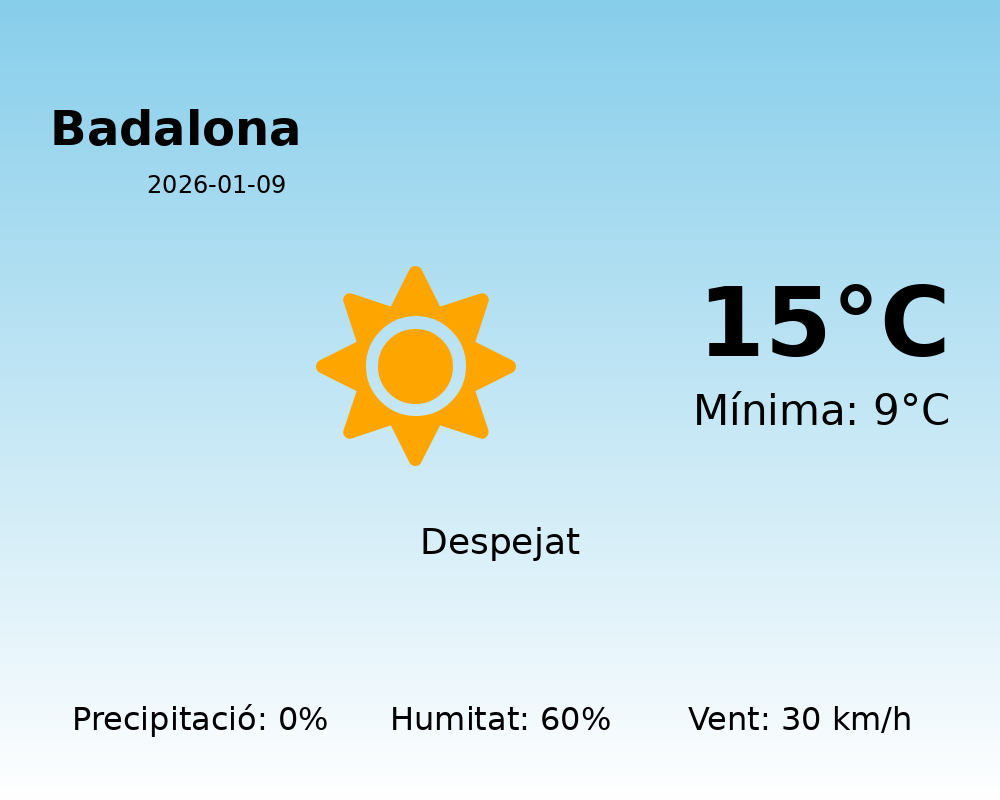 En resum, Badalona gaudirà avui d’un dia estabilitzat i radiant, acompanyat d’un clima agradable i sec amb vent moderat. Gaudiu-ne!